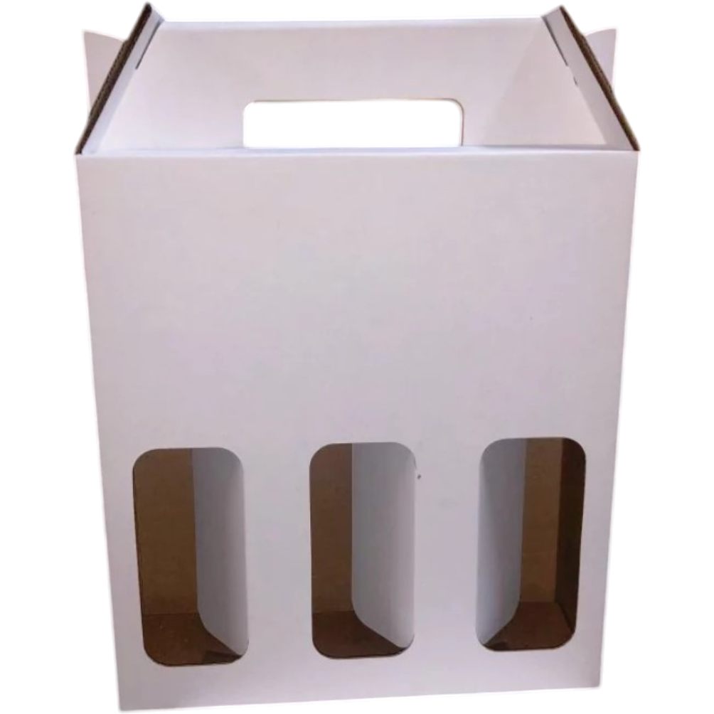 Informações das Embalagens: Modelo: TB 3G branco Ideal para garrafas 600/500ml, estilo Colorado, Terezópolis ... Material: Papelão Onda "E" Modelo: Caixa para 3 garrafas com alça. Medidas internas: 24 cm Larg. x 8 cm Prof. x 26 cm Alt Cor interna: Pardo Cor externa:Branco Gramatura do papelão: 390 gr